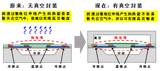 這次,世界首次成功將熱電堆真空封裝在芯片內(nèi)。采用真空封裝即可避免將熱電堆轉(zhuǎn)換的熱能散失在空氣中,使金屬接點(diǎn)之間的溫差變大,從而可實(shí)現(xiàn)更高的靈敏度。