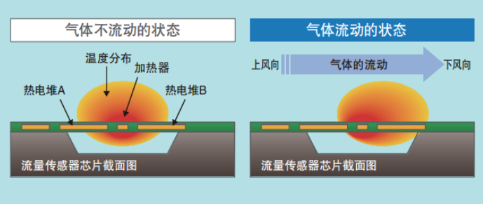 歐姆龍MEMS流量傳感器檢測原理:在沒有氣體流動的情況下以加熱器為中心,溫度分布左右對稱。流動的狀態(tài)下,加熱器上風向的溫度低,下風向溫度高,溫度分布不再對稱。將該溫差作為熱電堆的電動勢之差進行傳感,可測量流量、流速而不影響溫度、壓力。此外,熱電堆為熱電動勢方式,與電阻式相比,有助于降低功耗。