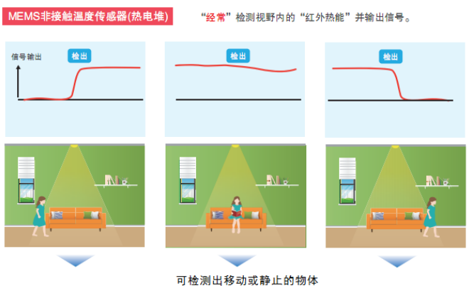 歐姆龍自主研發(fā)的D6T系列非接觸溫度傳感器, 采用獨(dú)創(chuàng)的MEMS技術(shù),將熱電堆元件和ASIC封裝在一起,實(shí)現(xiàn)了精度高,體積小,便于嵌入多種電子產(chǎn)品等特點(diǎn)。與熱釋電型紅外傳感器相比, 歐姆龍D6T系列非接觸傳感器不僅可以檢測動態(tài)物體,也可檢測靜止物體。通過物體表面細(xì)微的溫度差和溫度變化進(jìn)行檢測, 不僅適用于家電節(jié)能、安防設(shè)備、樓宇建筑等領(lǐng)域,也適用于護(hù)理看護(hù)類的應(yīng)用場景。