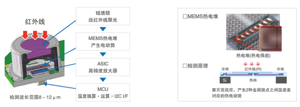 MEMS非接觸溫度傳感器(紅外傳感器)是由熱電堆元件接收來自對象物的紅外熱能,從而以非接觸方式檢測對象物表面溫度的傳感器。