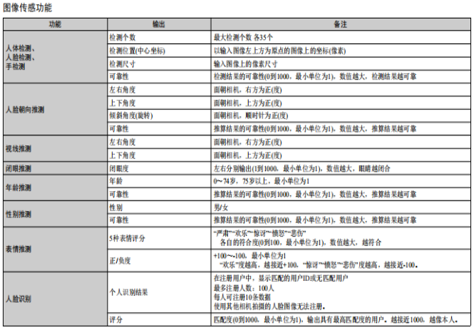這款人體識別圖像傳感器視覺組件(HVC)是歐姆龍“OKAOTM Vision”圖像傳感技術的組合產(chǎn)品,可通過攝像頭模塊識別人體眨眼、視線方向、表情、性別或年齡。 其較大速率下的響應時間是第一代HVC-P的10倍。 此外,還有兩種鏡頭可供選擇,長距離50度型(B5T-007001-010)和廣角90度型(B5T-007001-020)。客戶可根據(jù)檢測距離和FOV(視場)做出選擇。“HVC-P2”能夠檢測和推定對象的屬性和狀態(tài),而不會使其察覺攝像頭的存在,同時還能根據(jù)用戶需求提供對應服務。