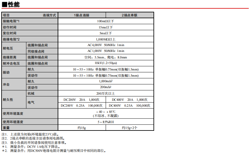 通過產品的2接點串聯實現了DC400V 20A雙向開閉 寬度15.2mm的纖細尺寸實現了無論極性的DC200V 20A開閉 功耗530mW的高靈敏度 (保持電壓50%的使用環境下實現更好的節能效果) 線圈和接點間的絕緣距離5.5mm以上,耐沖擊電壓10kV的高絕緣性 串聯連接取得了UL/TüV/CQC認證