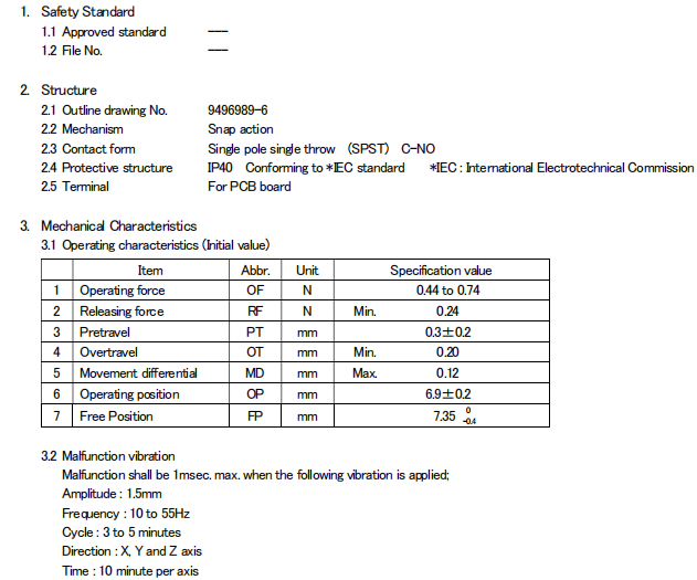 D2FC-F-7N(10M), 克力為:60+/-15G,壽命為1000萬次;