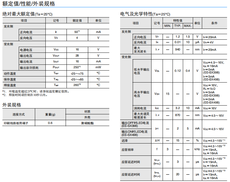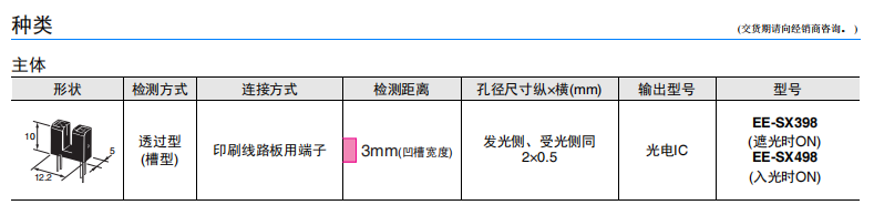凹槽端子型(槽寬:3mm) ? 光電IC輸出(分為遮光時ON(EE-SX398)/入光時ON(EE-SX498) 2種類型) ? 適用電源電壓為DC4.5~16V ? 可直接連接C-MOS