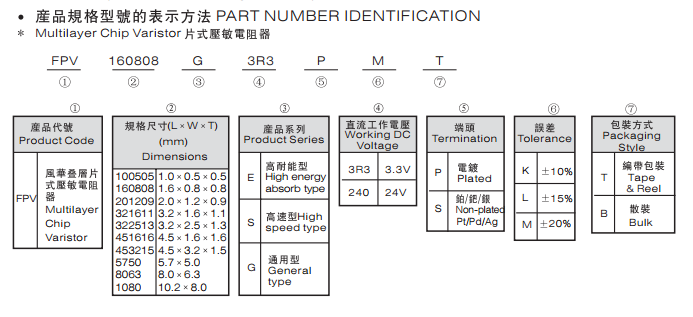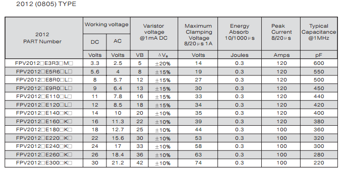 特征: 1、疊層片式陶瓷結(jié)構(gòu)。 2、無引線。 3、溫度范圍:-55℃~+125 ℃。 4、工作電壓范圍V w(dc)=3.3~ 615V。 5、具有雙向限制特性,適合ESD保護。 6、漏電流非常小。 7、寄生電感小、響應(yīng)速度快(響應(yīng)時間少于0.5ns)。 8、優(yōu)良的溫度系數(shù)。 9、良好的焊接性能(端電極為三層電鍍)。 應(yīng)用: 1、防止過電壓:當(dāng)施加的電壓升高到壓敏電壓時,壓敏電阻器的電流急劇上升,被保護設(shè)備的浪涌電壓迅速減小,從而使裝有壓敏電阻器的設(shè)備抗浪涌噪聲能力達到相應(yīng)要求。